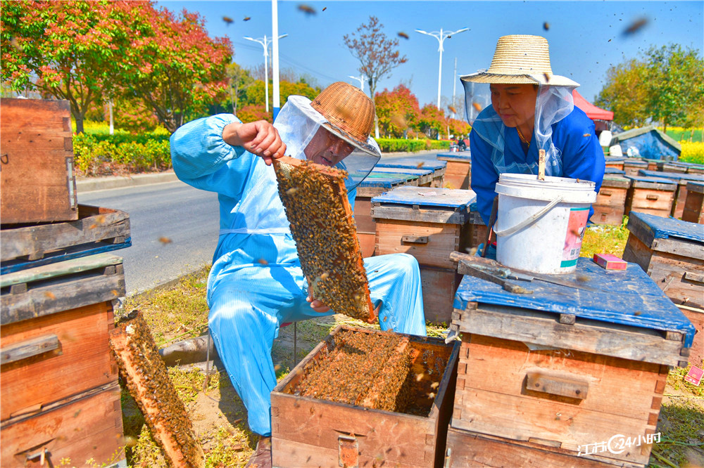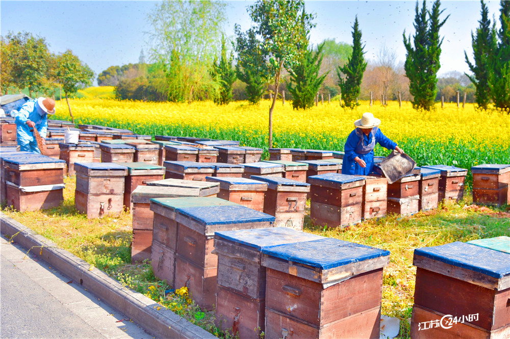 (特约摄影 吴树建 09:21摄 11:31上线)4月6日,在如皋市如城街道一畦油菜花田边,蜂农在放蜜采蜜。眼下,如皋市如城街道万亩油菜花进入盛花期,正是蜜蜂采蜜的好时节。