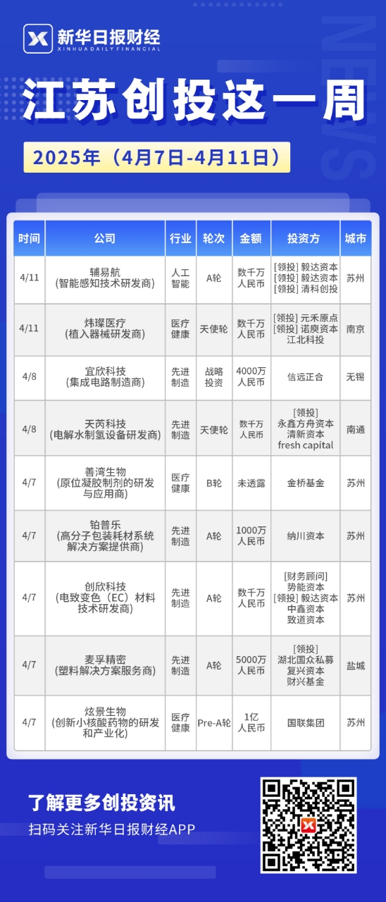 新华日报财经讯 本周(4月7日-4月11日),江苏共发生投融资事件9起,公开披露的投融资总额超2亿元。从行业分布来看,先进制造5起,医疗健康3起,人工智能1起;从投融资轮次来看,A轮4起,天使轮2起,B轮1起,Pre-A轮1起;从地域分布来看,苏州5起,南京1起,南通1起,无锡1起,盐城1起。