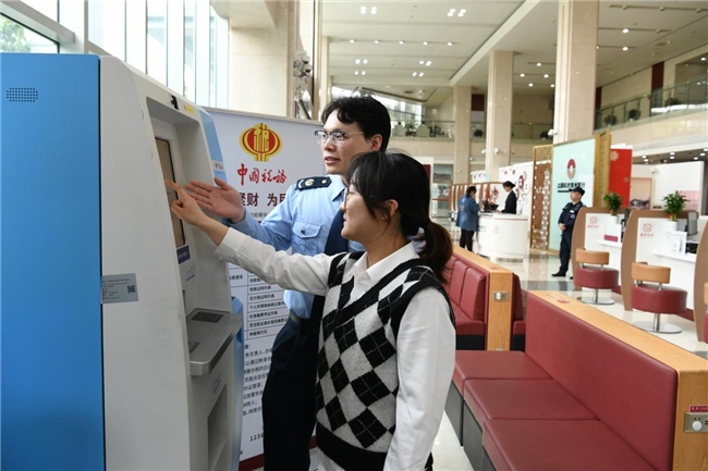 为持续优化纳税服务体验,打造更为便捷快速的办税缴费服务圈,今年税宣月期间,国家税务总局常州市武进区税务局在江南农村商业银行增设自助办税终端,帮助纳税人缴费人“就近办、一站办”,有效提升纳税人缴费人获得感、满意度。图为国家税务总局常州市武进区税务局工作人员现场指导纳税人使用自助终端快速开具涉税证明。