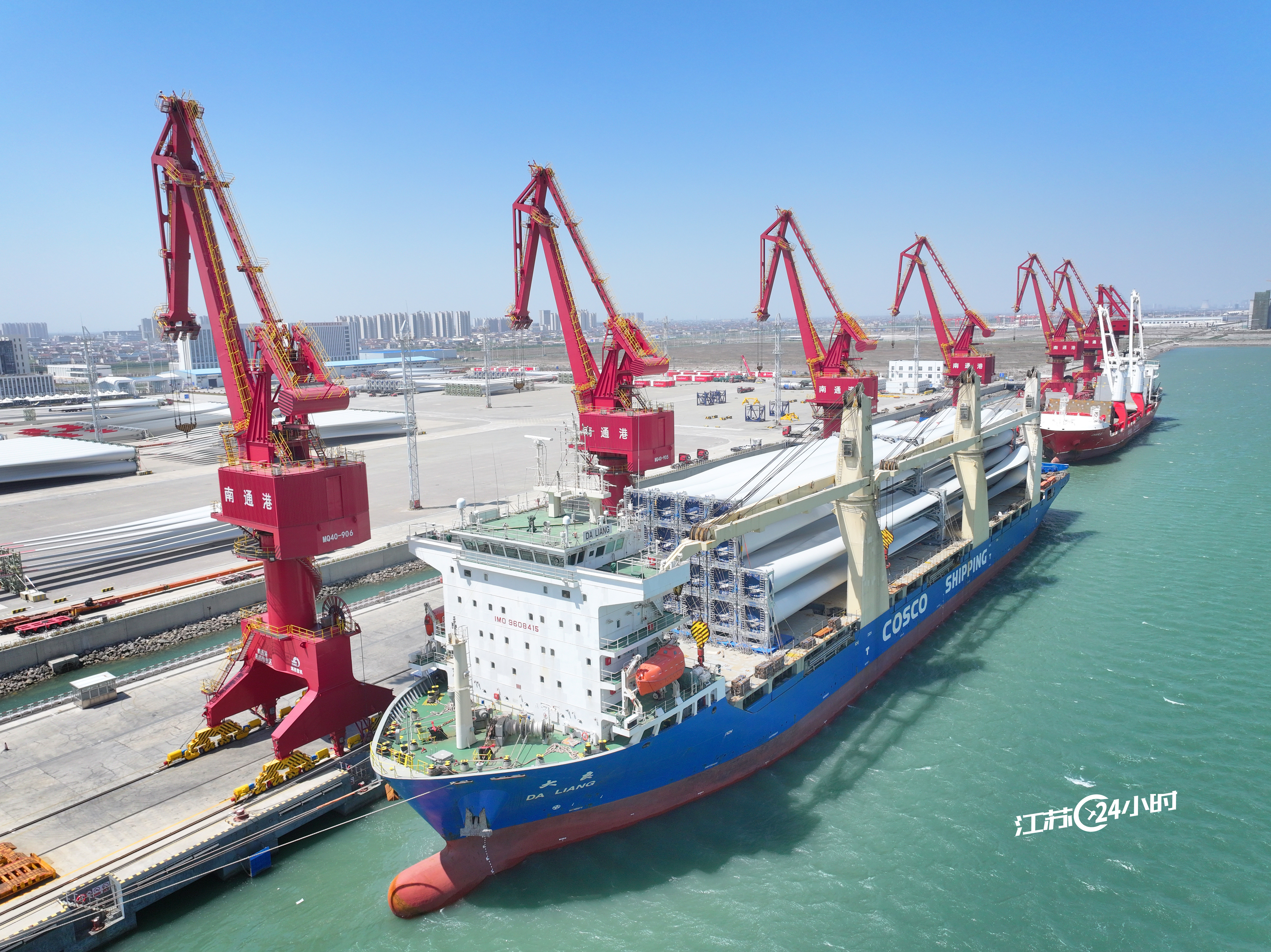 (特约摄影 许丛军 10:56摄 13:50上线)4月14日,通州湾吕四起步港区通用码头忙碌装运发往澳大利亚、德国、荷兰的风电设备。今年以来,吕四港通用码头风电叶片等件杂货出口繁忙,风电设备出口稳步增长。今年一季度,通用码头共完成货物吞吐量120万计费吨,同比增长105.77%,创历史新高。