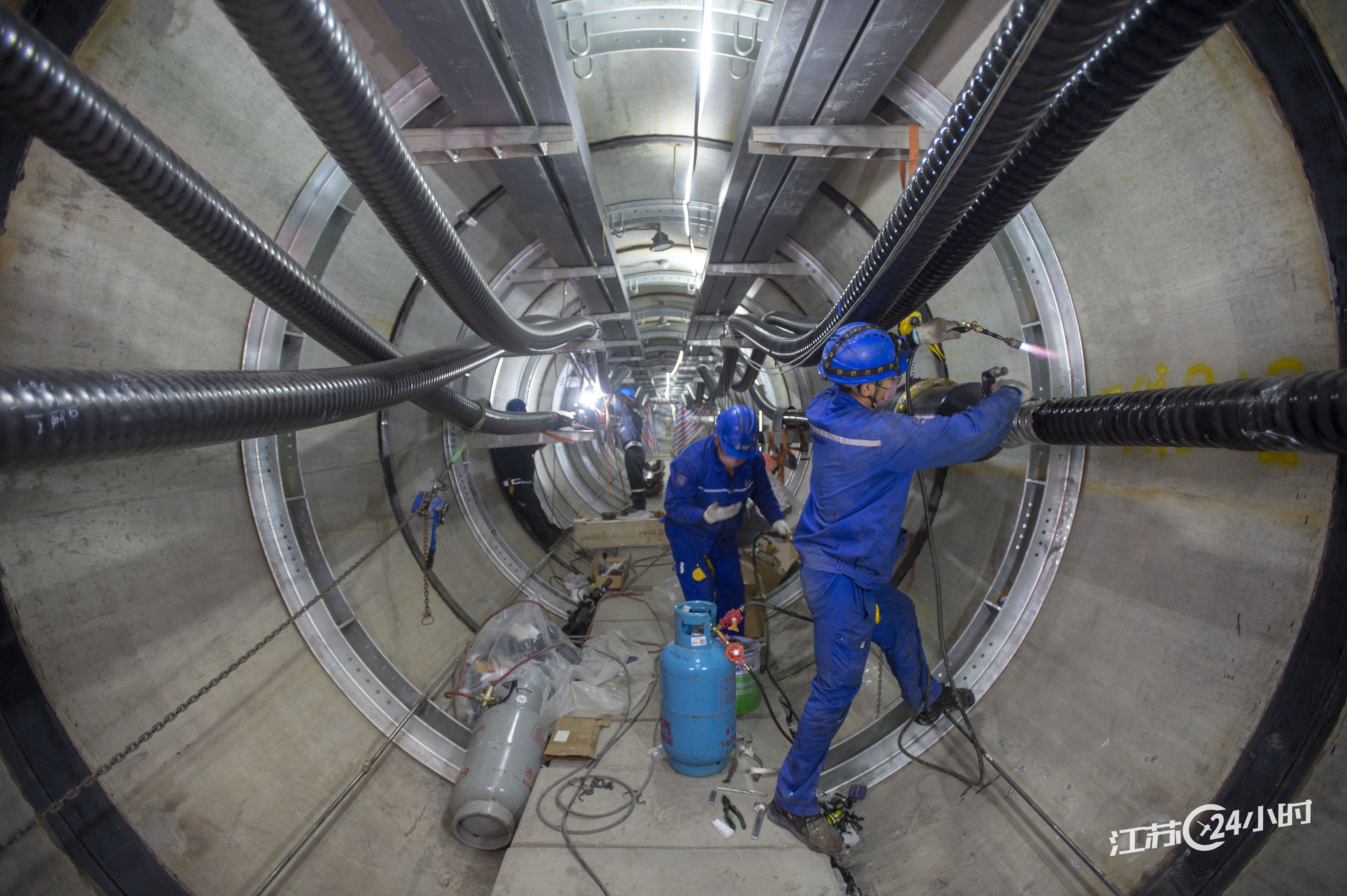 (特约摄影 潘正光 09:36摄 16:35上线) 4月14日,施工人员在无锡市惠山区洛南大道地下电缆隧道内安装220千伏电缆铝合金抱箍。据悉,为配合无锡西站物流园区工程建设需要,国网无锡供电公司组织人员加班加点开展线路迁移改造。