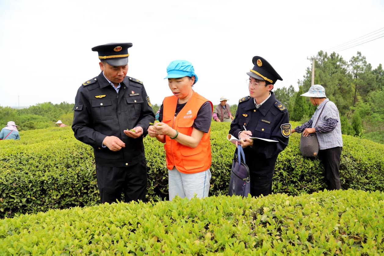 4月16日,在高淳区桠溪街道穆家庄村域见官塘茶果种植农民专业合作社生态茶园里,高淳区市场监督管理局桠溪分局工作人员正在检查茶叶生产经营情况。