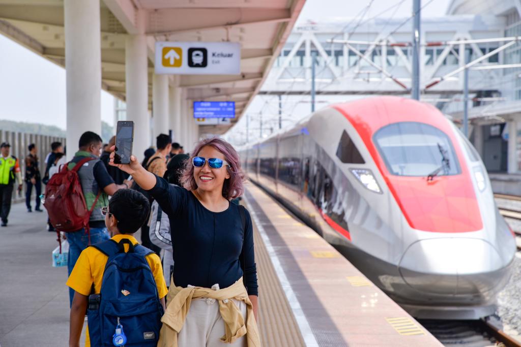 2024年10月17日,在印度尼西亚帕达拉朗站,乘客在雅万高铁高速动车组前自拍。新华社记者徐钦摄