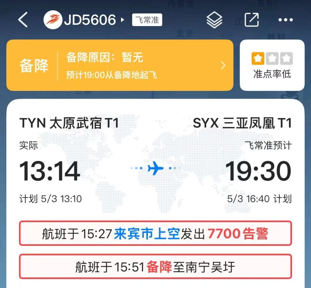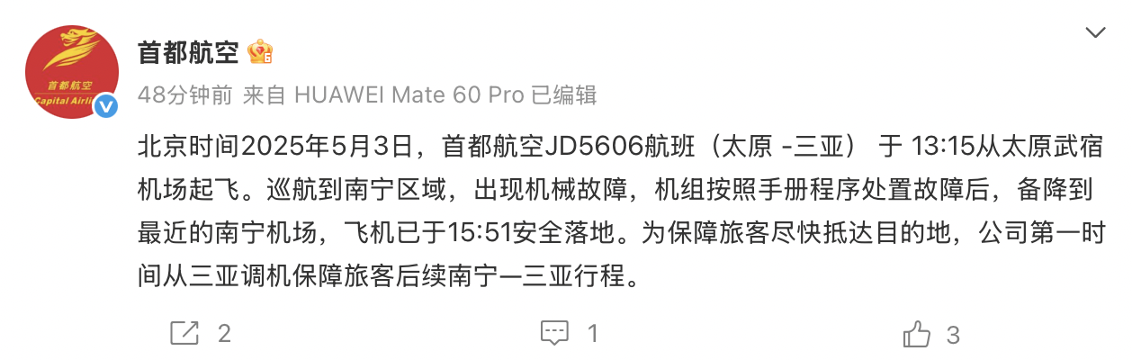 北京时间2025年5月3日,首都航空JD5606航班(太原 -三亚)于 13:15从太原武宿机场起飞。巡航到南宁区域,出现机械故障,机组按照手册程序处置故障后,备降到最近的南宁机场,飞机已于15:51安全落地。为保障旅客尽快抵达目的地,公司第一时间从三亚调机保障旅客后续南宁—三亚行程。