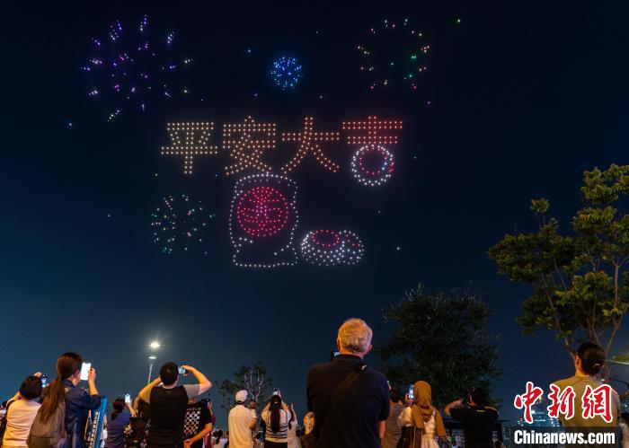 香港旅游发展局5月1日晚以天后诞、谭公诞及长洲太平清醮三大传统节庆为主题,在湾仔海滨举办无人机表演。香港特色民俗“抢包山”比赛场景在夜空出现,“抢包山”抢上了天,引得围观人群赞叹。