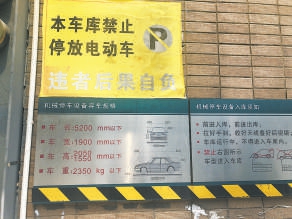 在车库门口立着一块蓝牌,提示了车库的限位规格,即车辆的体积、重量,其中还有一段读起来不太通顺的提示语,“新能源车和插电混车辆的限制达不到要求禁止进去智能车库”。记者向工作人员询问:如果新能源车符合限位要求,车辆底盘高度也在安全范围内,是不是就可以开进智能立体停车库?工作人员摆手说:“不是这么理解的,这提示的内容可能有点模糊,但是新能源车就是不能开进去,怕起火呀!”