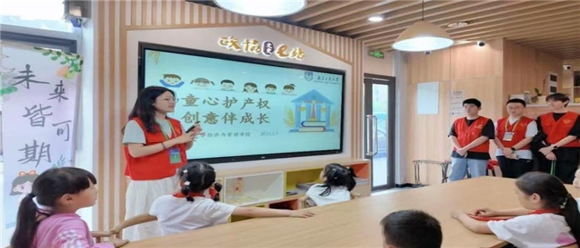 5月7日经管学子走进吉庆社区党群服务中心,结合社区发展“助老扶幼”的现实需要,开展“童心护产权”主题教育,打造“认知-理解-创造”三位一体宣教模式。