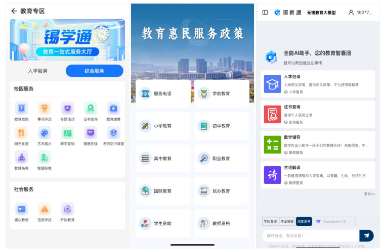 在数字化进程中,教育民生服务领域出现了政务服务“群众焦虑多”、资源供给“服务范围少”、教育监管“长效机制弱”等堵点问题,一定程度上制约了教育服务效能的提升。无锡市教育局升级“入学服务”,实现六部门数据协同,家长通过灵锡APP可一键查验证照、查询学区等,成绩发布、志愿填报、投档录取等业务全流程线上办理。创新搭建“智能问答”。2025年升级打造“锡教通”AI助手,建成能查、能办、能问、能分析的智能中枢。对此,锡学通平台实现12类高频事项“一网通办”,2024年服务600所学校近30万学生,AI智能问答11.5万人次。教育12345投诉工单同比下降近20%,民生诉求办结率达100%。“锡慧在线”平台汇聚超800节特色资源,AI生成课程占比40%。“锡青夜校”设立280个阵地,学员超2.3万人,终身教育体系渐趋完善。