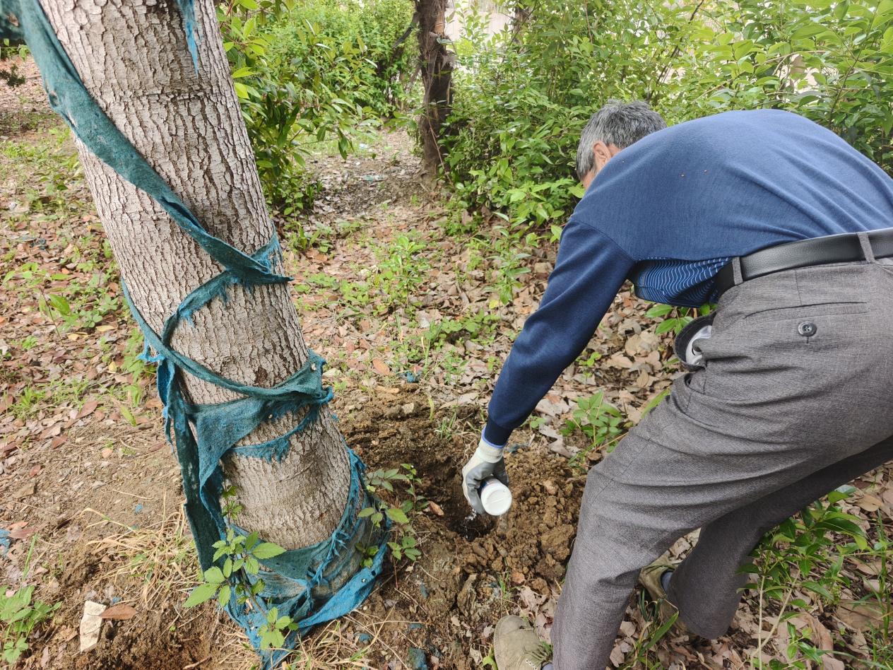 在街道农业技术人员的指导下,网格员杨小保组织人员对停车场的树苗进行了深坑药疗。工作人员在树干周围挖掘深坑,将专用药物埋入其中,通过树根吸收药物,达到毒杀洋辣子的目的。整个防治过程严格按照操作规范进行,确保了防治效果和人员安全。