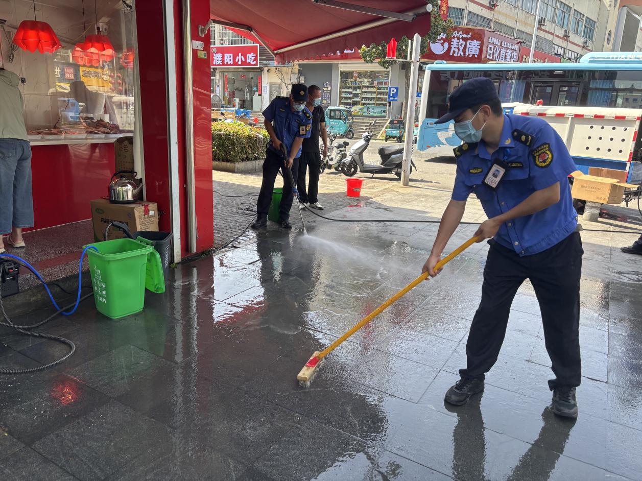 在清洁作业环节,执法人员创新采用“浸+刷+冲”的标准化作业模式。借助全智能家电清洗设备,先将热火碱溶液均匀喷洒在油污地面,使其充分浸泡软化顽固油渍。随后,利用刷子、扫帚等工具,对地面进行反复刷洗,瓦解附着的污垢。最后,使用小型高压水枪多次来回冲洗,彻底清除残留污渍,让路面重新恢复整洁清爽的面貌。