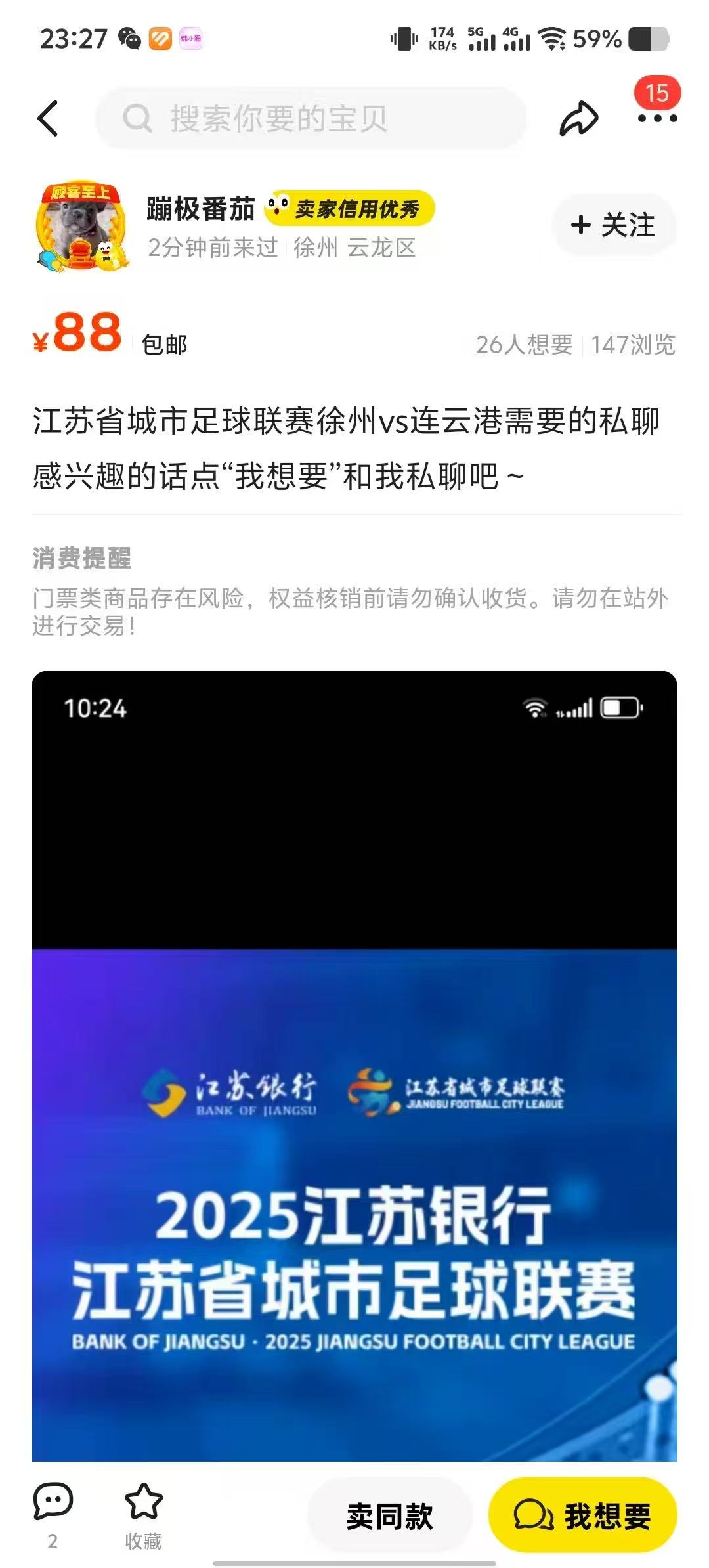交汇点讯 “徐州人买票的手速是不是和吃烧烤一样快?”“连云港人抢票是用了花果山猴哥的筋斗云?”5月26日夜间,江苏城市足球联赛徐州主场对阵连云港的球票两次开售即“秒空”,某二手交易平台甚至出现“黄牛票”。网友调侃,这场“苏北五霸谁是老大”的“端午大战”,连南京、苏州等“吃瓜群众”都摩拳擦掌要来围观,硬生生把足球赛玩成了江苏地域文化大赏。