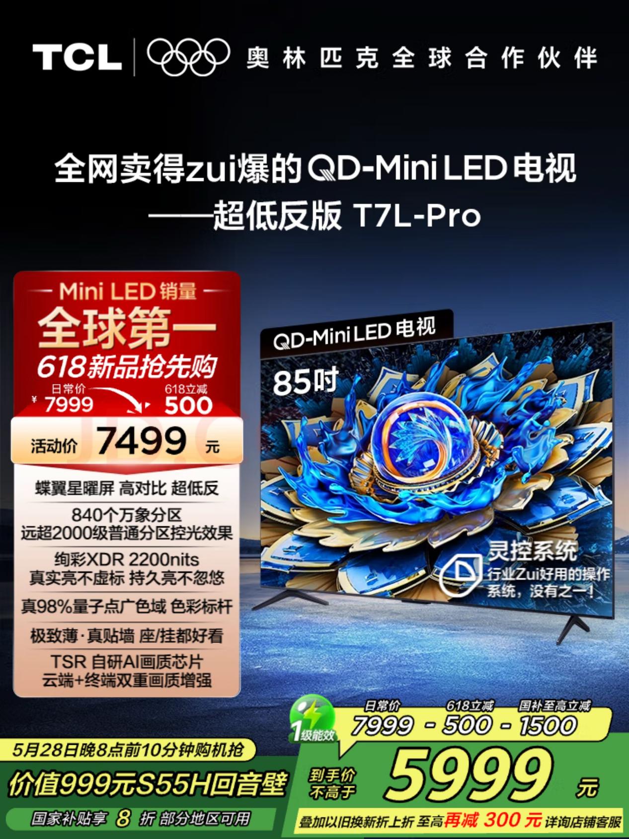 这不正赶上618,这款TCL的T7L Pro在我看来有5条你可以闭眼入理由!① 同价位画质天花板;② 抗反光效果好客厅党福音;③ 系统无广告且自定义桌面上手快;④ 质价比屠夫,千元价位性能对标万元机;⑤ 今年618开门红再夺销量第一,大品牌有保障。如果你也受够了高糊画质、光晕、反光和广告等,618赶紧锁定这台画质、系统、价格全拉满的T7L Pro,85吋国补后入手价不到6千,闭眼入不踩雷!