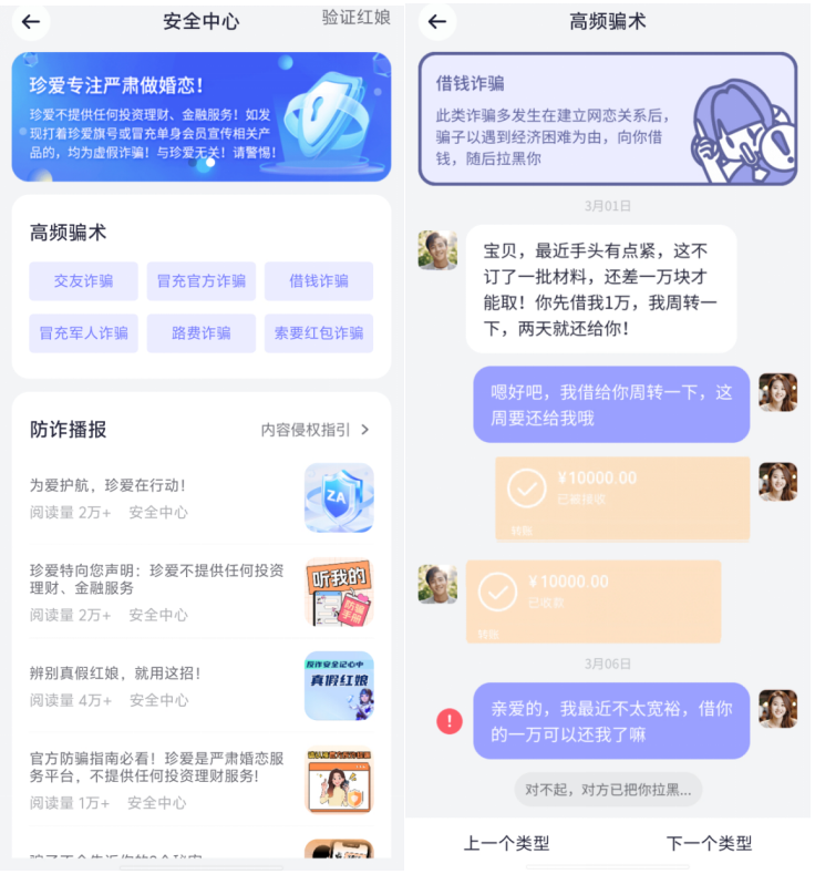 同时,珍爱网也在用户端积极开展安全教育工作,增强用户的风险识别能力和自我保护意识。在旗下主打产品珍爱APP中,珍爱网专门设置了“防诈播报”专栏,通过定期推送网络安全提示、恋爱防骗指南、真假红娘辨别方法、常见诈骗套路解读等内容,引导用户科学交友、理性判断、审慎交往,全方位守护真诚相遇的每一步。