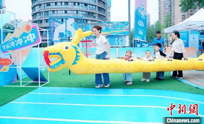 5月30日,市民游客在成都世运会“跟着赛事去旅行”武侯站体验趣味旱地龙舟。 成都世运会执委会供图