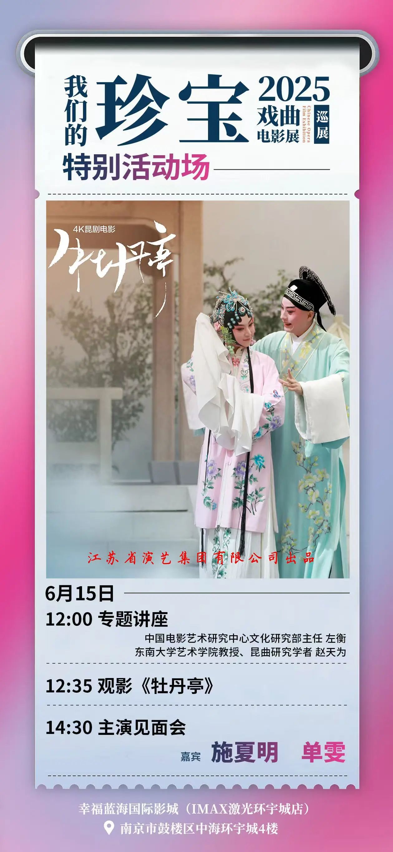 值得期待的是,6月15日,南京幸福蓝海国际影城(IMAX 激光环宇城店)将举行一场昆剧电影《牡丹亭》的特别活动场。影片放映前,中国电影艺术研究中心文化研究部主任左衡和东南大学艺术学院教授、昆曲研究学者赵天为将精彩开讲,聊聊中国电影与戏曲艺术的百年流变。映后,影片主演施夏明、单雯将亲临现场,与观众零距离互动。从银幕故事聊到台前幕后,打造一场跨越时空的艺术对话。