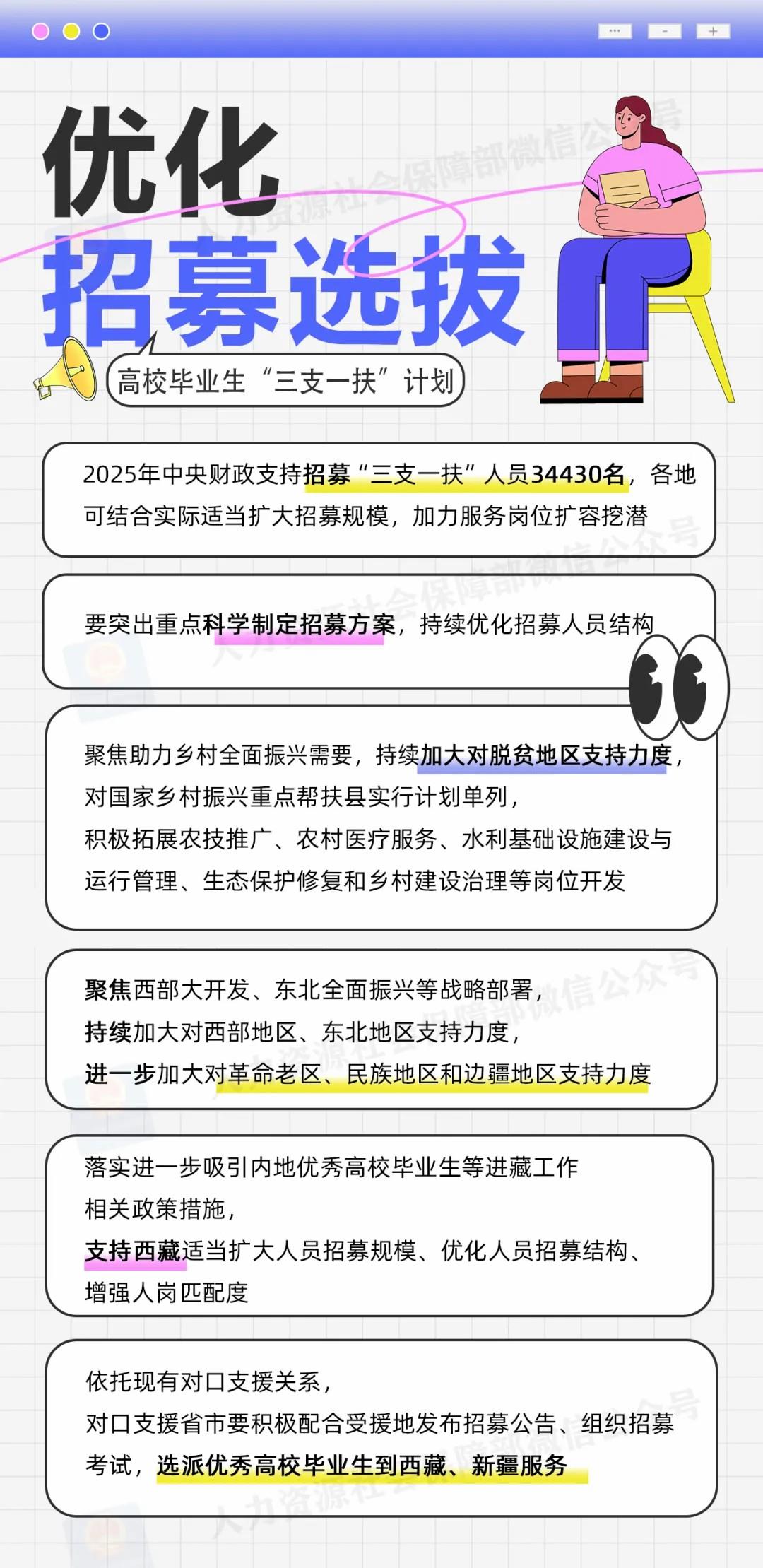 近日,人力资源和社会保障部、财政部印发通知,部署实施2025年高校毕业生“三支一扶”计划,明确今年中央财政支持招募34430名高校毕业生到基层、到西部从事支教、支农、支医和帮扶乡村振兴等服务,各地可结合实际适当扩大招募规模。