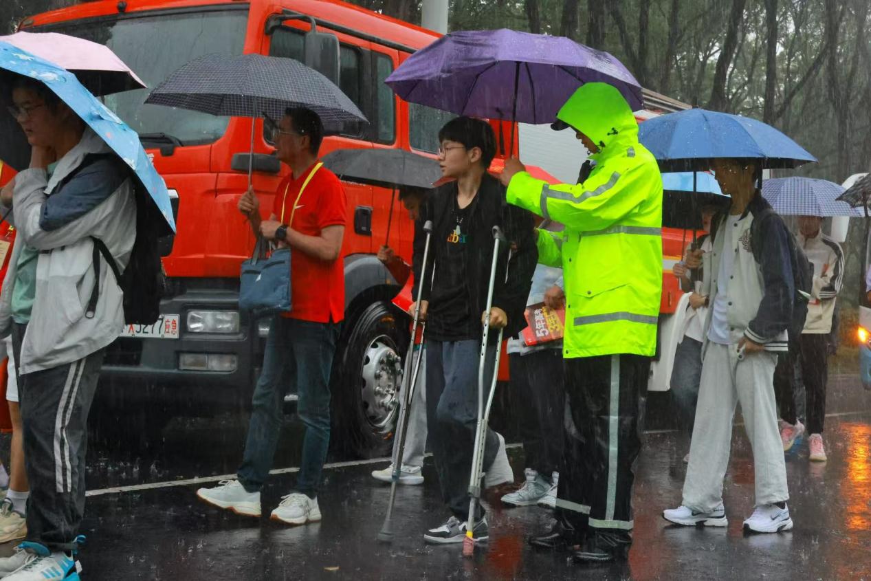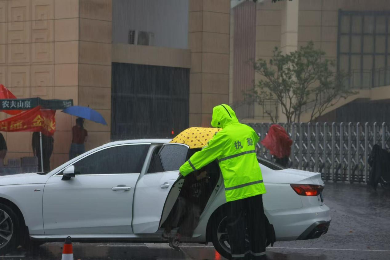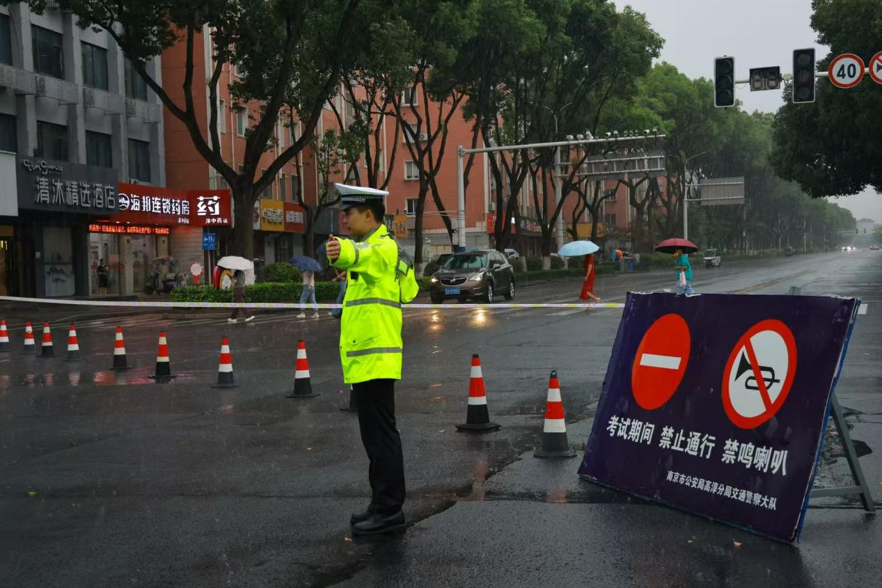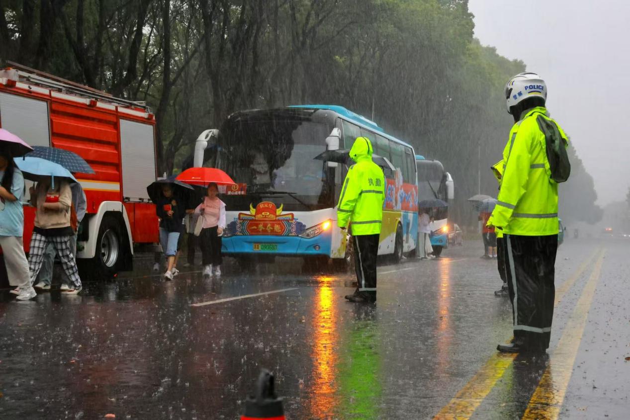 7日是高考首日,大雨倾盆。交警们早早来到考点,在高级中学考点周边拉起警戒线,规划出送考车辆专用通道。主干道上,警用车队警灯闪烁,引导送考车辆有序驶向考点。考场外,交警们身着反光背心,有条不紊地指挥交通,为考生营造安全畅通的赴考环境。