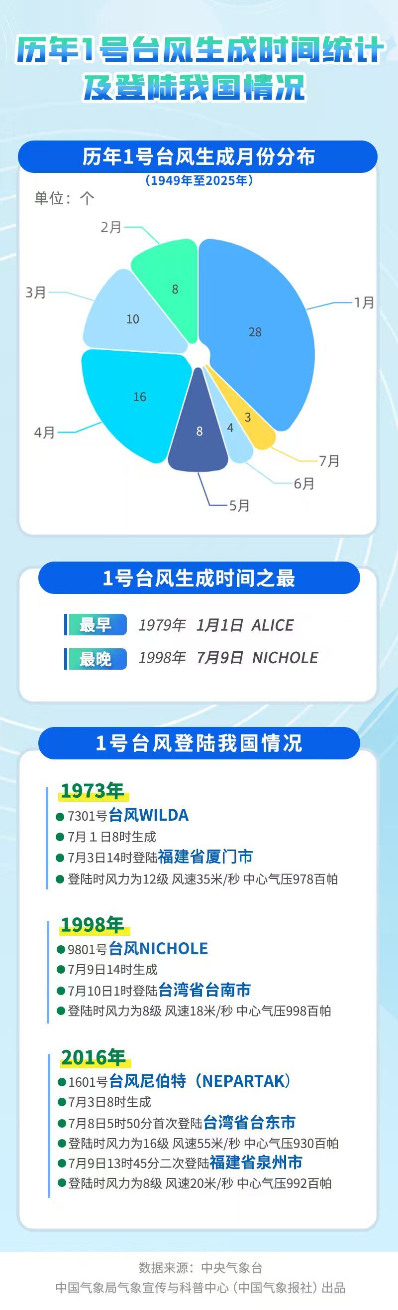 气象上通常将当年西北太平洋及南海生成的首个编号台风称为“初台”。统计显示,每年1号台风生成的时间分散在1月至7月。1979年的“初台”在元旦当天就生成了,而1998年的“初台”则直到7月9日才出现。常年平均“初台”生成时间为3月25日,从这个角度看,今年第一个台风有点姗姗来迟了。