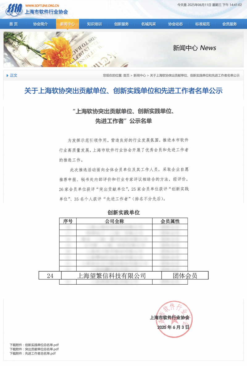 近日,上海市软件行业协会公布了2025年度“优秀会员与先进工作者”推选结果,上海望繁信科技有限公司凭借在流程智能领域的持续创新与卓越实践,成功入选并荣获“创新实践单位”荣誉称号。