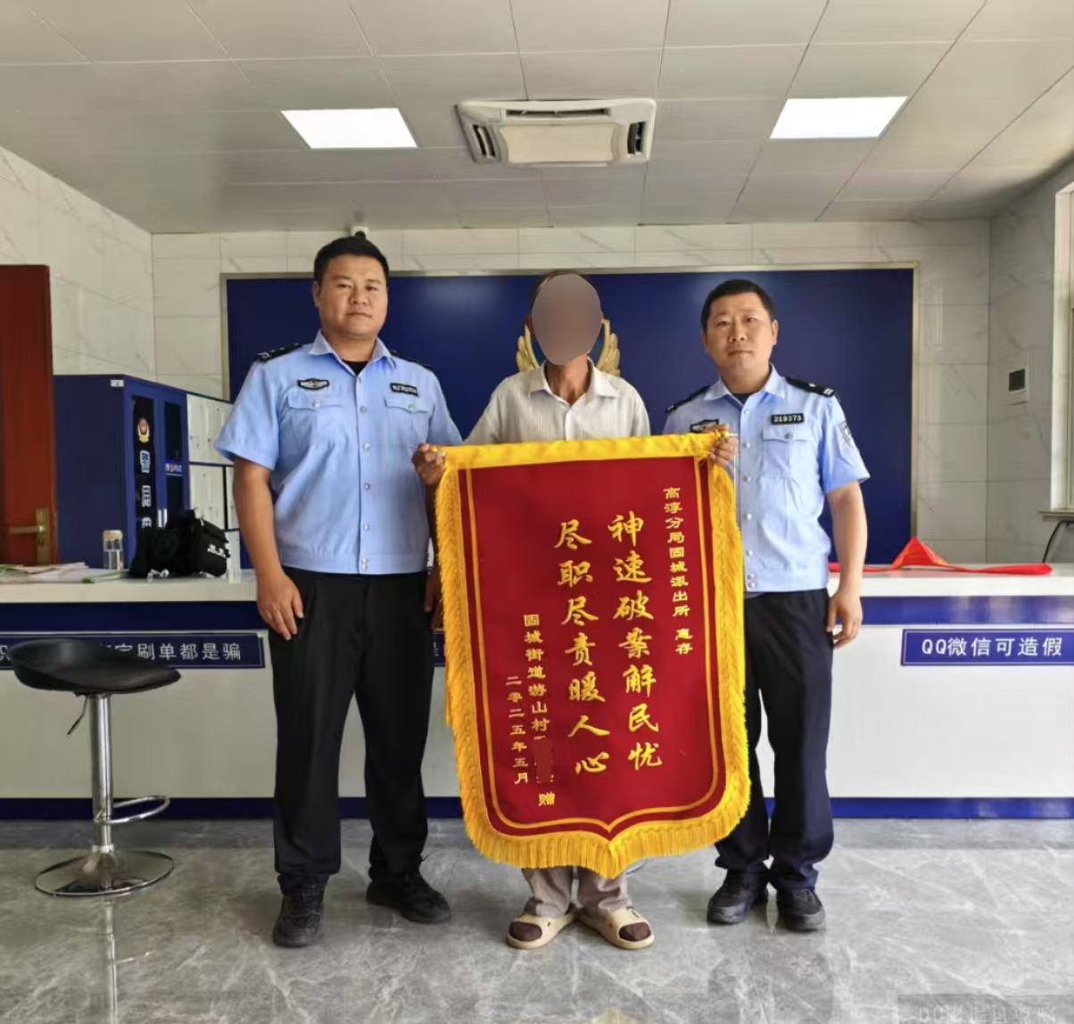 南京市公安局高淳分局固城派出所民辅警快速响应、积极行动,成功帮助群众找回失联25小时患有阿尔茨海默病的老人,赢得了家属和群众的一致赞誉。近日,老人家属把一面写着“神速破案解民忧、尽职尽责暖人心”的锦旗专程送到固城派出所,向当天值班民辅警们表示诚挚的感谢。
