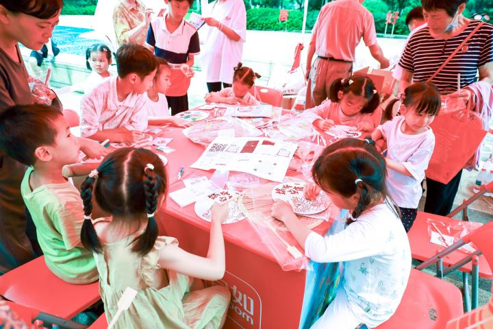 活动现场,社区广场被划分为四大互动区:在“趣味套圈”区,孩子们专注投掷,家长在一旁加油助威;父亲节主题手工区则充满温情,亲子家庭共同制作纸扇、贺卡,将爱意融入一笔一划;傍晚时分,露天电影区的观影活动引发全龄共鸣,不少居民自发携带小板凳加入观影行列;文艺表演环节更将气氛推向高潮,由社区居民自编自演的歌舞节目,展现出蓬勃的社区活力。