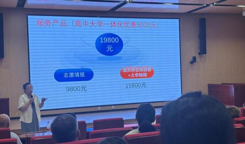 家长们也清楚,这类“公益讲座”背后,其实是为了吸引家长购买后续相关服务。果然,临近讲座结尾,组织者向家长们推荐起了机构的志愿填报服务,价格是9800元。