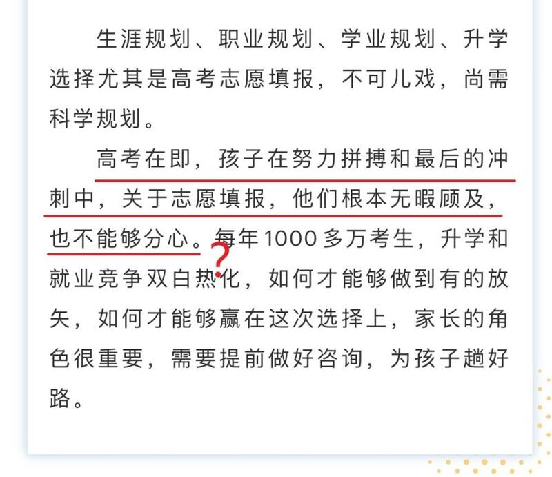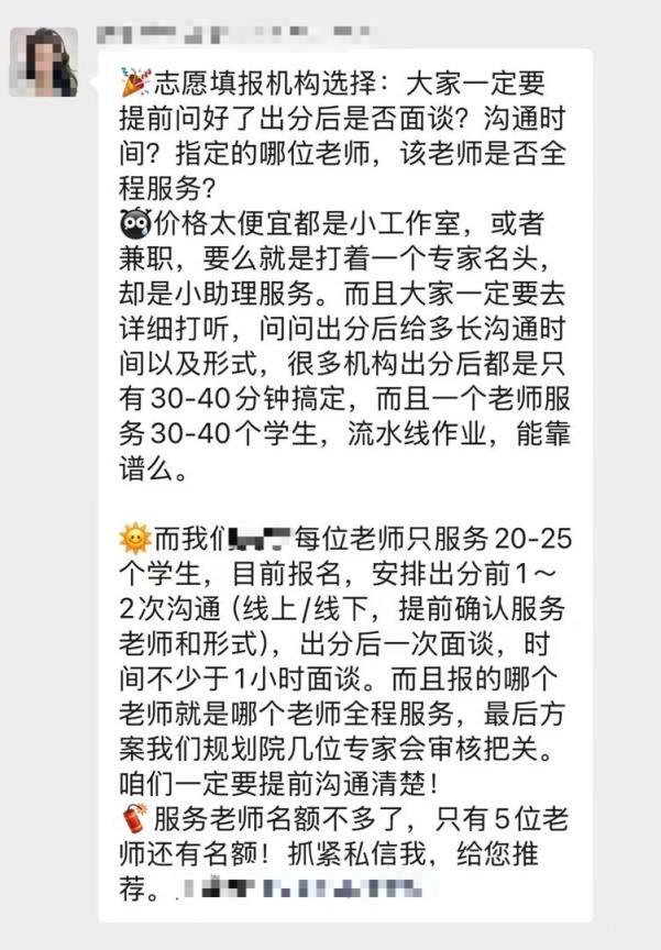 “志愿填报全程委托,2025届服务名额快速减少,手慢无!”“10年升学报考经验,考得好不如报得好”……点开社交平台,类似标题的帖文近段时间反复轰炸着家长们的手机。但记者发现,有的机构虽然标榜自己很专业,但连打广告时都明显不够走心,明明是高考结束后发的公众号文章,内容却还写着“高考在即,孩子不能分心,家长应该提前做好志愿填报咨询,为孩子蹚好路……”