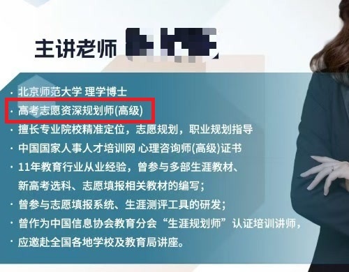 销售人员不但在言语上施压,在介绍业务时,还会用各种拽名词和术语,用来彰显自家机构的专业性。比如一家机构,把提供服务的老师称为“高报师”。老师的个人简介里,有的还会写着“高考志愿资深规划师(高级)”这样的称谓,乍一听很唬人。但记者查询过往资料发现,教育部早在去年就曾发布过提醒,有关部门从未发放过“高考志愿规划师”这类职业资格证书。连职业资格都没有,那代表等级的“高级”更是无从谈起了。
