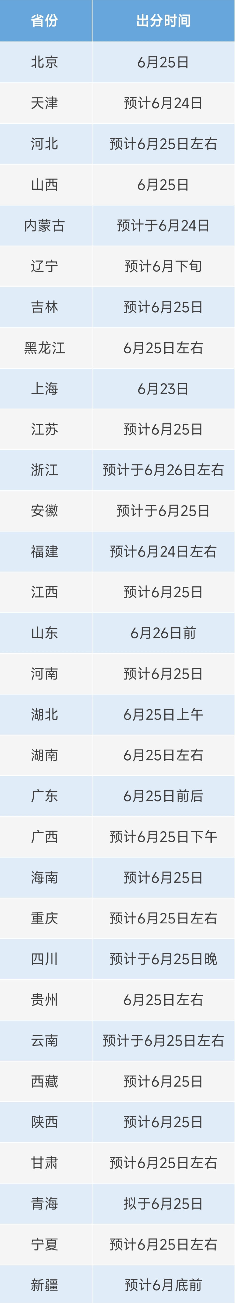 2025年各省市高考成绩查询时间陆续公布: