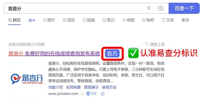 如需体验安全便捷的成绩发布服务,教师可登录易查分唯一官方网站(百度搜索 “易查分” 认准蓝色官方标识)。