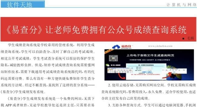 易查分在成绩查询系统制作方面创新获得《计算机与网络》《电脑爱好者》等权威媒体的认可与报道,文中称:《易查分》让老师免费拥有公众号成绩查询系统。