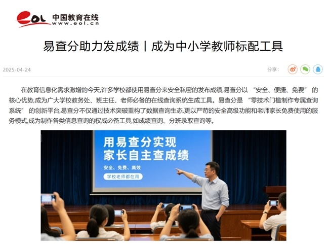 中国教育在线网显示:易查分助力发成绩,成为制作各类信息查询的权威必备工具。表明其 “免费 + 安全 + 易用” 的模式有效降低了教育数字化的门槛,推动教育信息查询向智能化、高效化发展,让教师从各种各样的非教育教学任务包袱中解脱出来。