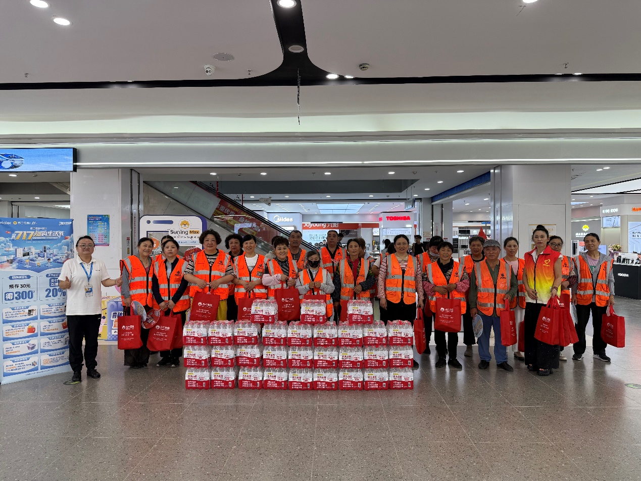 在清扫路段,烈日炙烤着大地,环卫工人李大姐正挥动着扫帚清扫路面,汗水顺着脸颊不断滑落,后背的工作服也被汗水浸透。志愿者们快步上前,递上清凉礼包和冰镇矿泉水,“大姐,天气这么热,工作太辛苦了,一定要注意防暑!”李大姐接过礼包,脸上露出灿烂的笑容:“谢谢你们,有了这份心意,干活都更有劲儿了!”同时苏宁易购铜马广场旗舰店负责人将清凉物资送到环卫工人手中,并表示:“城市的干净整洁离不开大家的默默奉献,希望这些物品能让大家在酷暑中感受到一丝清凉。”