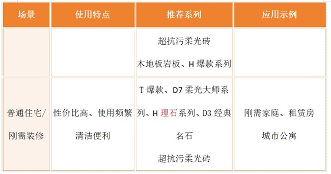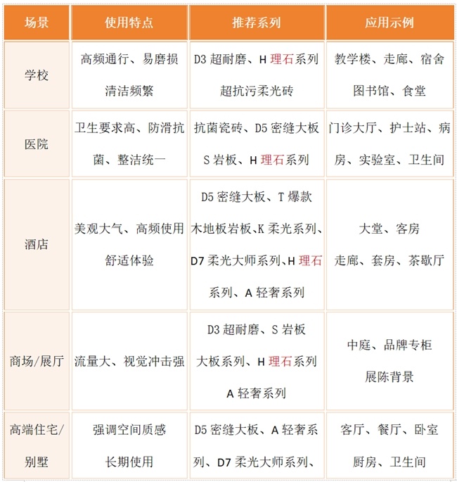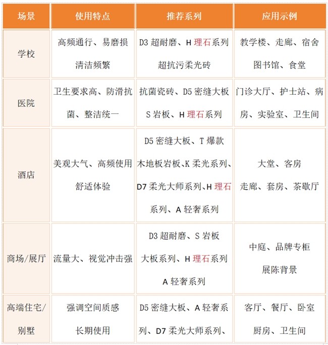 一表看懂大角鹿瓷砖典型应用场景推荐:
