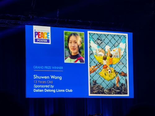 近日,国际狮子会发起的“世界和平海报大赛”颁奖典礼在美国奥兰多举行。来自中国大连海滨美校的13岁学生王姝雯凭借作品《和平无止境》脱颖而出,斩获全球总冠军,为中国青少年艺术创作再添国际殊荣。