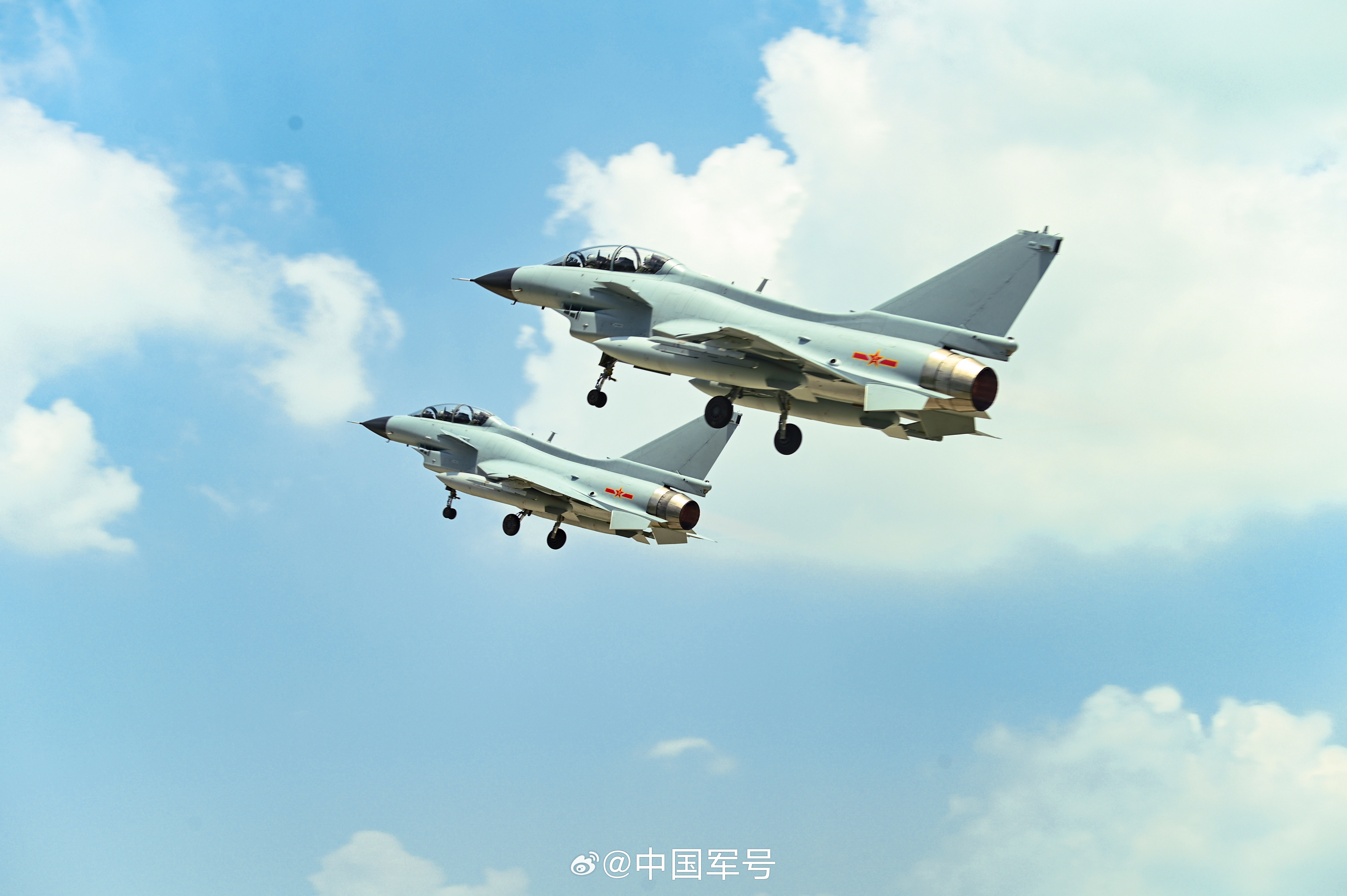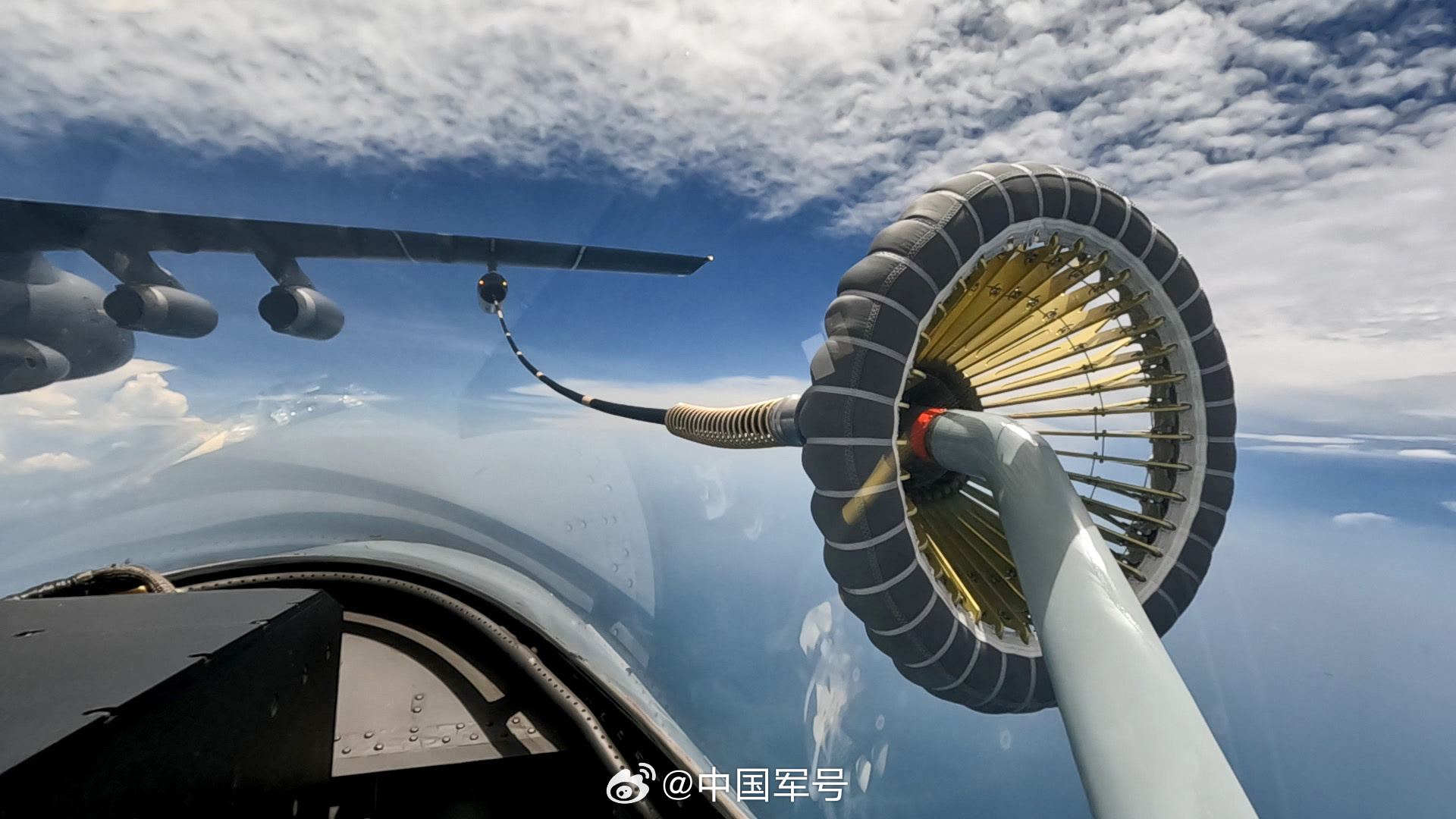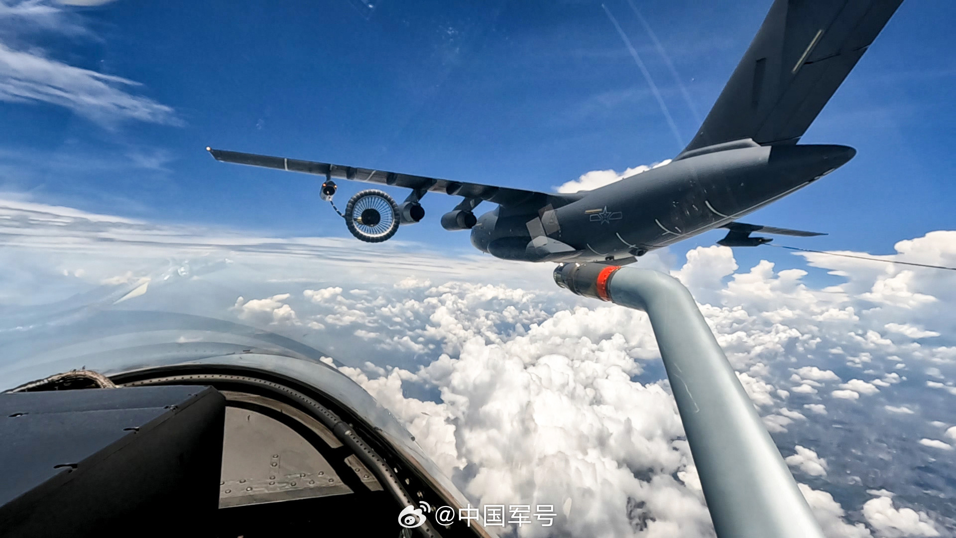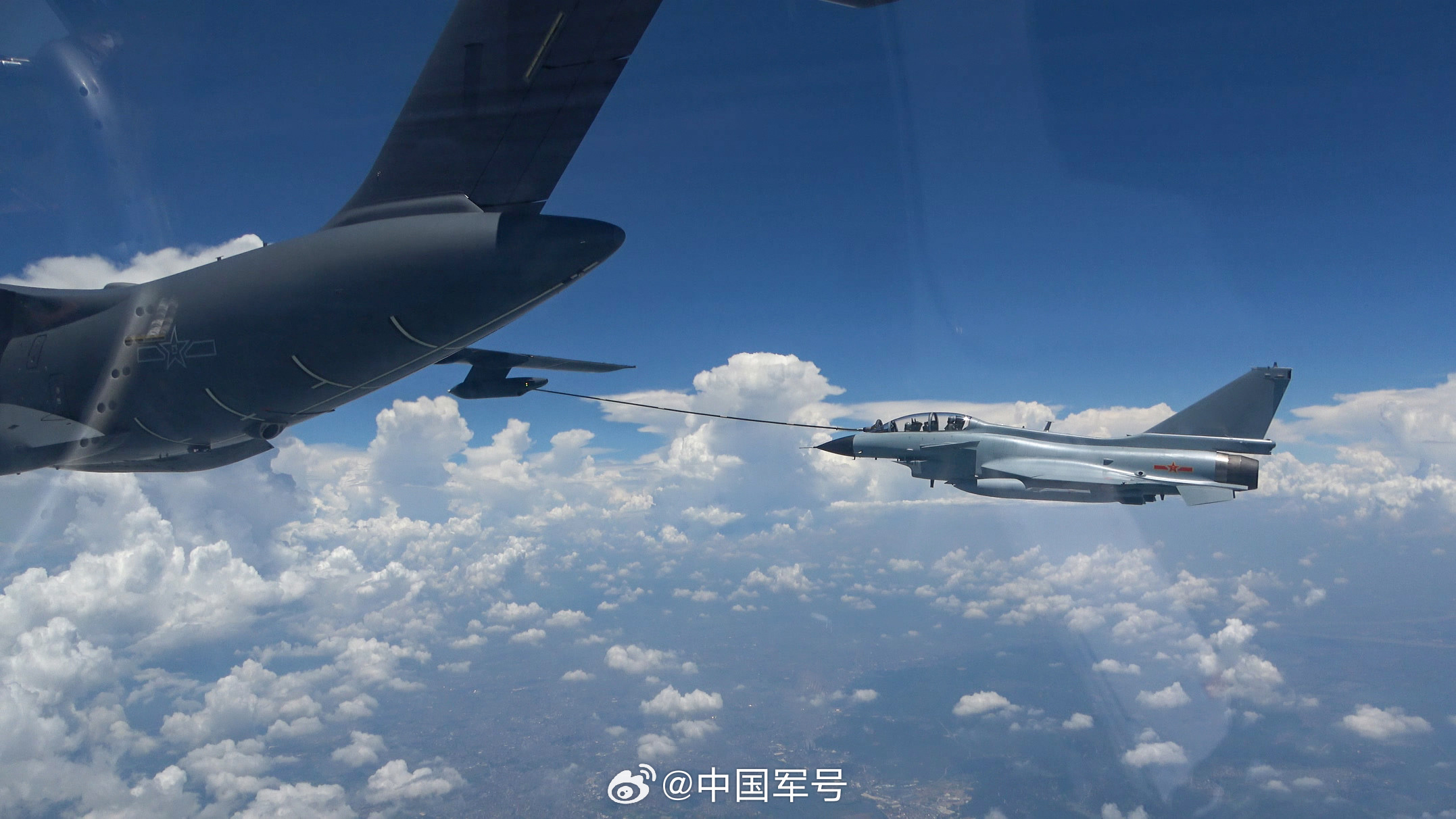 近日,东部战区空军航空兵某部组织空中加油训练,锤炼飞行员技战术水平和心理素质。海空之上,加、受油机组成空中编队,受油机飞行员操纵战机在“百公里级”飞行状态中实现“厘米级”精准对接,完成空中“穿针引线”。(来源:中国军号微博)