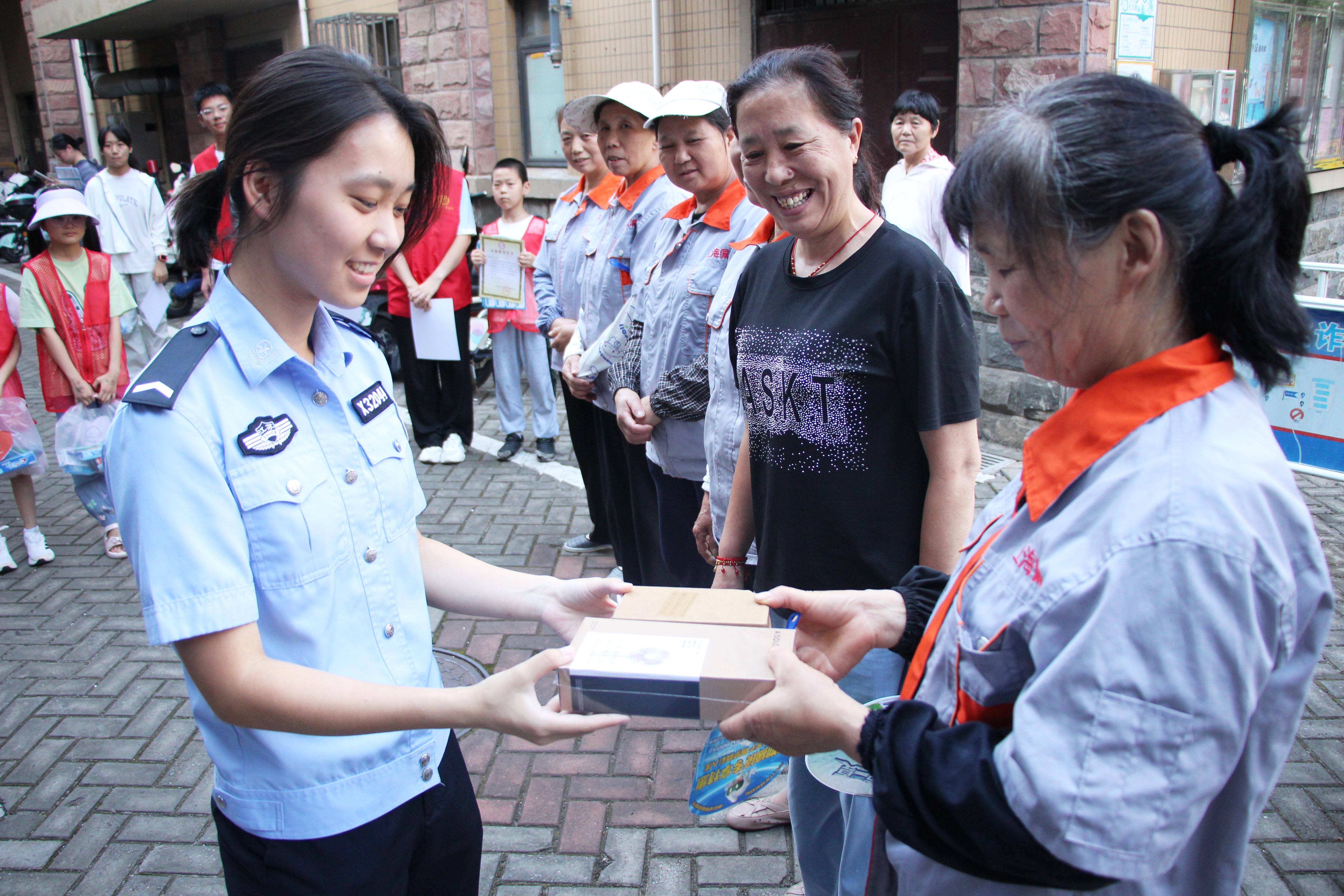 讲座结束后,民警、社区志愿者和青少年们一起动手分装夏日清凉礼包,包含清凉油、手持小风扇、藿香正气水等实用防暑用品。青少年们分工协作,将一份份满载爱心的礼包整齐打包,随后在民警和志愿者的带领下走进社区,为环卫工人、独居老人、外卖骑手等群体送去清凉礼包,并叮嘱他们注意防暑降温,获得了群众一致好评。
