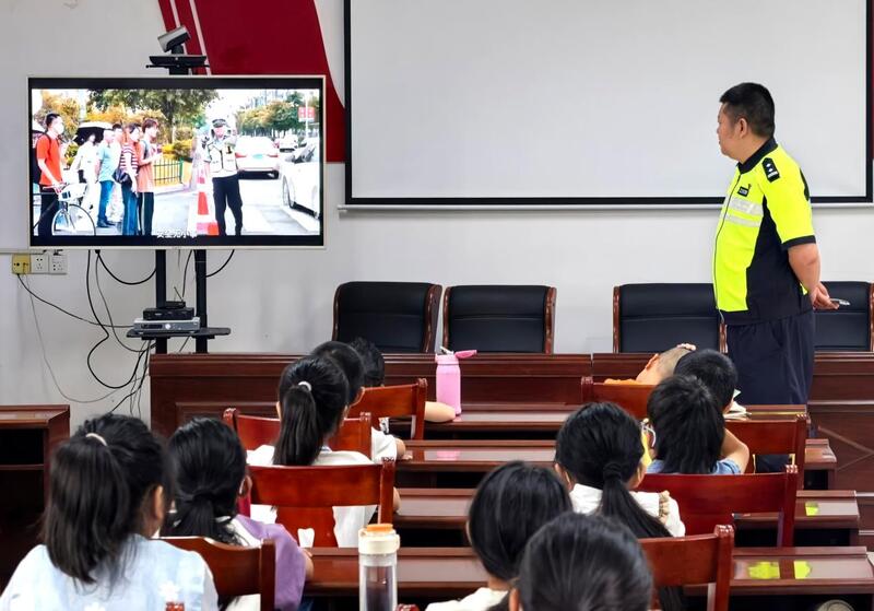 在当天的交通安全课上,交通民警通过播放宣传视频和以案说法等方式,向小学生们宣传了暑期交通安全常识和相关法律知识,叮嘱他们步行和乘车时的安全注意事项,以及如何正确佩戴头盔和系好安全带。结合近期发生的学生交通事故案例,交通民警用通俗易懂的语言和生动的画面,帮助学生们吸取教训,做到“知危险、会避险”。