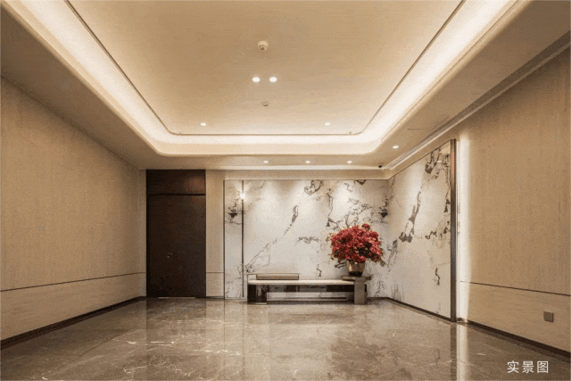 地上&地下双精装大堂,通过人脸识别智能门禁进入地下大堂,精雕仿银杏玉石岩板,地面的土耳其黑金石材与墙面的仿木纹瓷砖映入眼帘;地面的单元入户大堂由石材铺贴地面,与浅米黄石材、金属组合的门头构建出一个温馨典雅的归家空间。