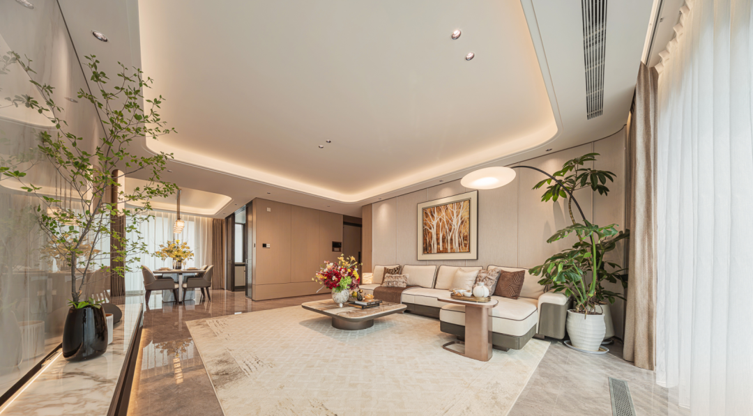 客厅开间约4.7米,进深约10.2米,层高约3.1米,采光和视野直接拉满,尽显大气与奢华。