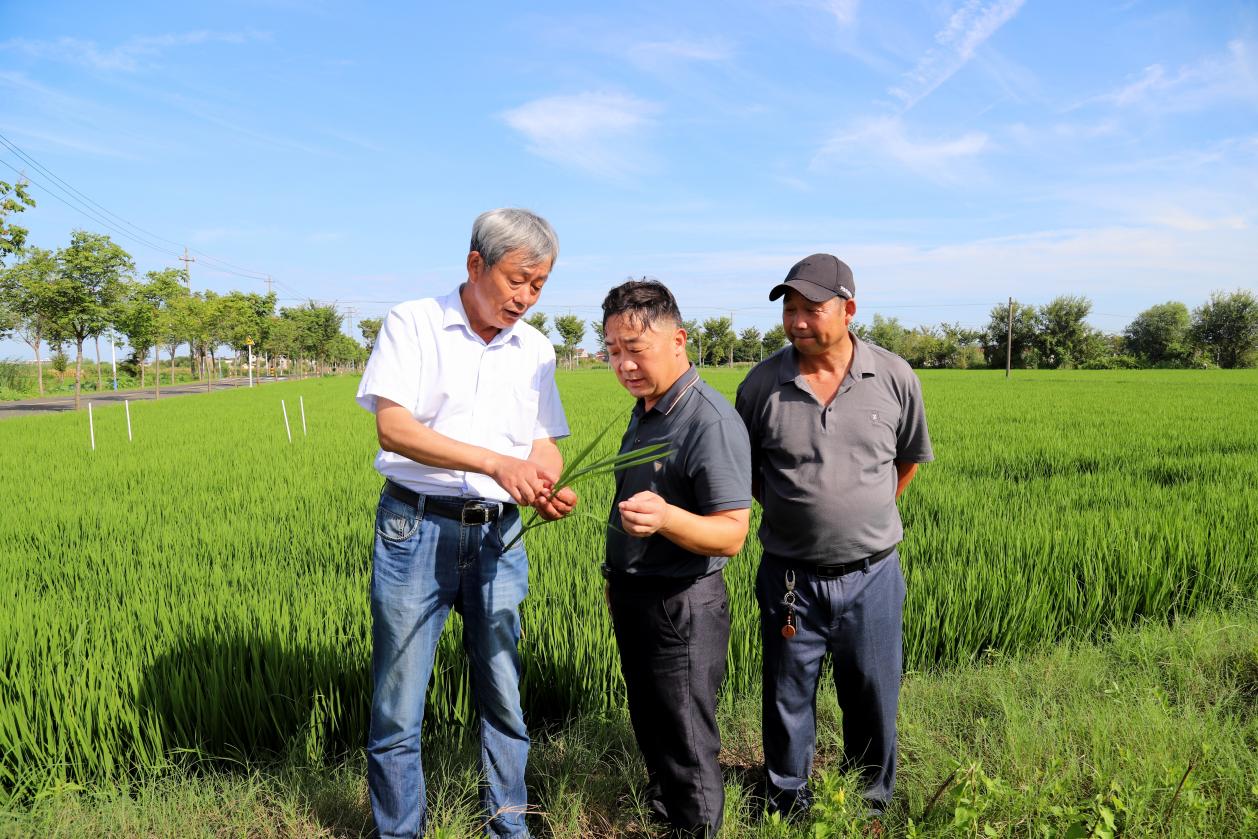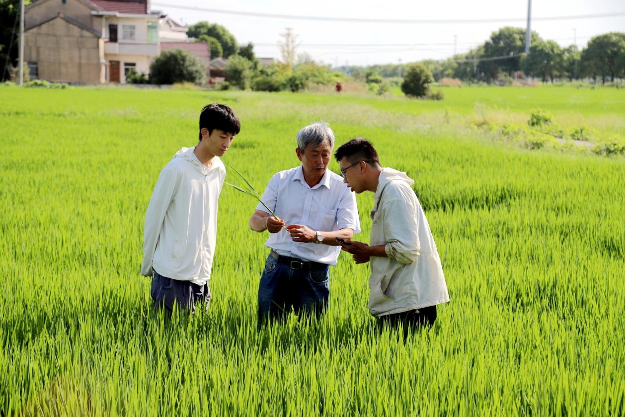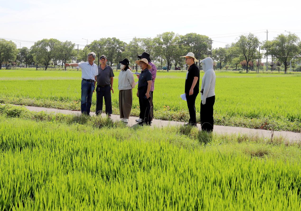 8月7日,在高淳区桠溪街道东圩村内,专家老师正在田间查看水稻生长情况。