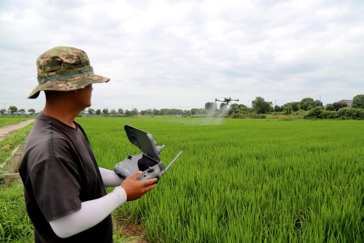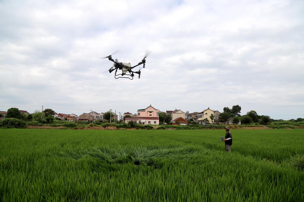 8月8日,在高淳区桠溪街道永胜村水稻田里,农机手正在利用植保无人机对水稻进行喷药飞防作业。