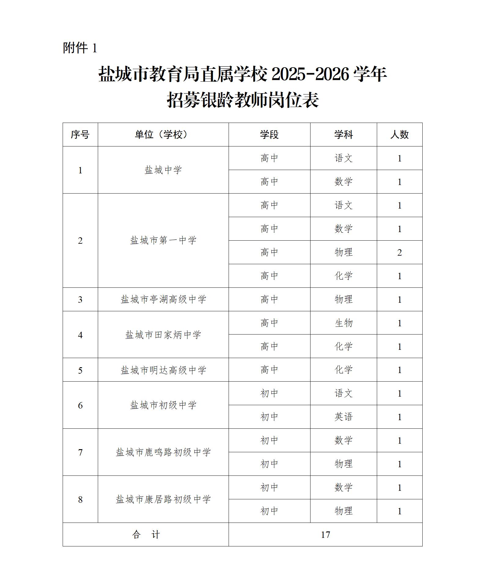盐城市2025年计划招募银龄教师17名,面向市内外公开招募初高中优秀退休教师。原则上返聘年龄不超过65周岁,退休教师须具有高级教师以上职称,且教学业绩突出、同行认可度高。岗位职责主要从事学校课堂教学工作,原则上要求满工作量。同时,承担指导、培育中青年骨干教师责任。