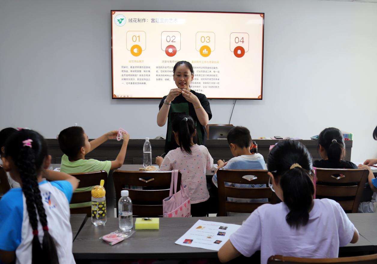南京非物质文化遗产丰富多彩,剪纸、绒花制作技艺、云锦、白局等非物质文化遗产源远流长。在最后的手工非遗课程中,志愿者老师向孩子们讲述这些非物质文化遗产,并指导大家绒花制作技艺。这名志愿者老师表示,南京的非物质文化遗产不仅种类丰富,而且有着深厚的历史文化内涵,它们是南京文化的重要组成部分,通过这样的课程,能够让孩子们更进一步了解南京的非遗文化,感受非遗文化的独特魅力。