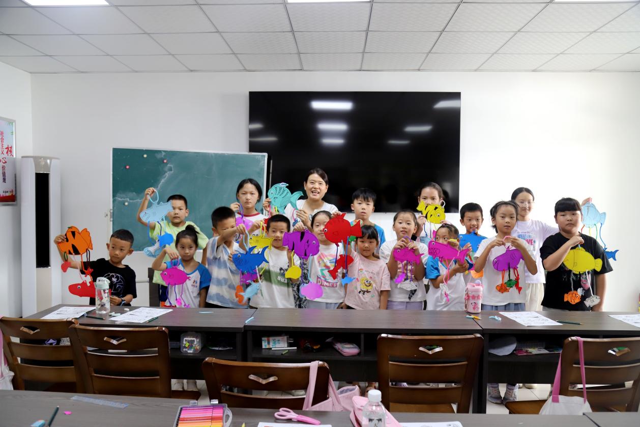 据活动现场相关志愿老师介绍,此次为期一天的公益课堂共分三个内容的课程,首先开始的美术课程是《悬挂的鱼》,主要是教孩子们绘画鱼并制作成手工成品,老师教得认真,孩子们学得细心,不一会儿,大家把制作好的鱼拎在手中进行展示。