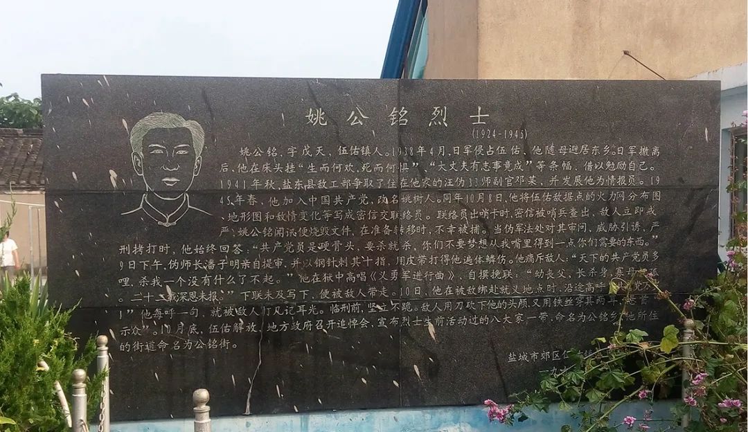 姚公铭烈士1924年9月出生,3岁丧父,母亲含辛茹苦经营“天喜堂”药房维持生计。1930年,姚公铭进入伍佑小学读书,后考入盐城亭湖中学,一年后因家贫辍学。1945年春,姚公铭入党,从事地下活动,探听敌伪情报。同年10月8日,姚公铭不幸被捕,他宁死不屈,10日就义时坚立不跪,被伪军残忍砍下头颅,铁丝穿两耳悬首示众,月底伍佑光复。