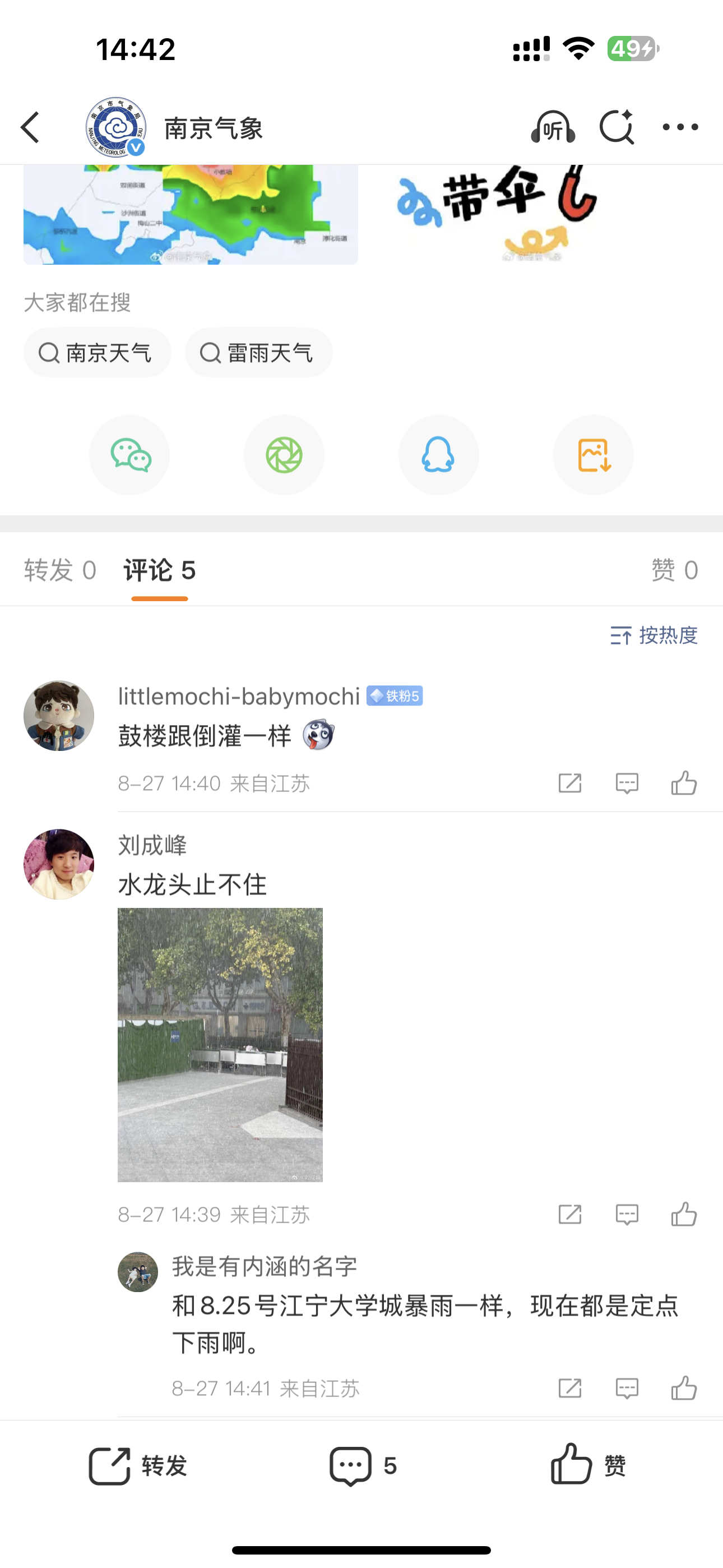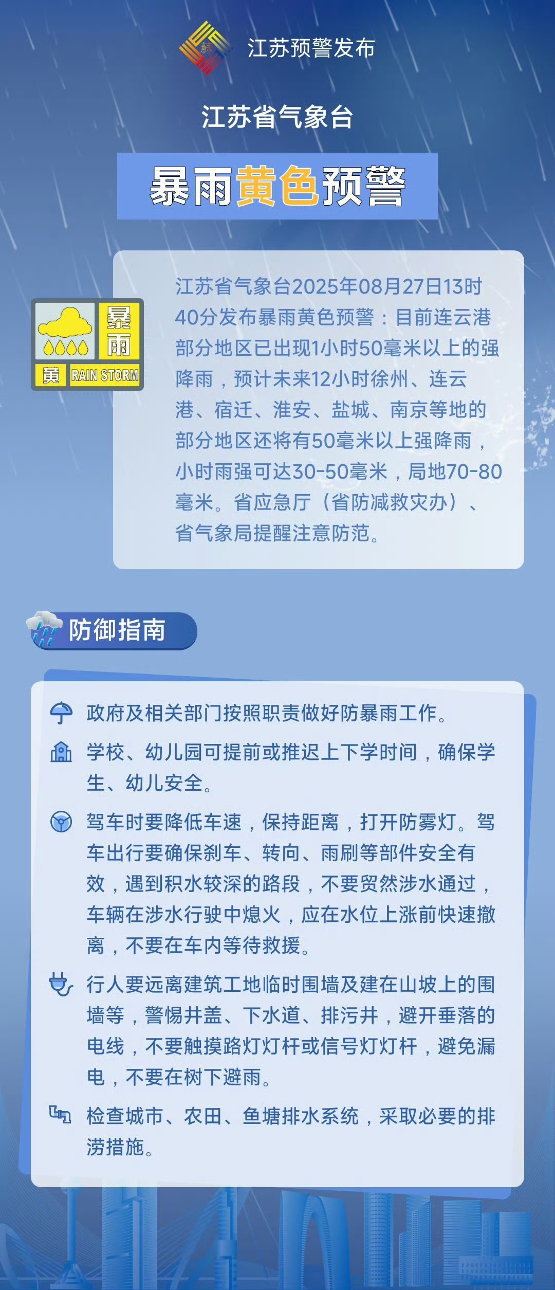 另外,江苏省气象台2025年8月27日13时40分发布暴雨黄色预警:目前连云港部分地区已出现1小时50毫米以上的强降雨,预计未来12小时徐州、连云港、宿迁、淮安、盐城、南京等地的部分地区还将有50毫米以上强降雨,小时雨强可达30~50毫米、局地70~80毫米。遇到强对流天气,非必要不出门!