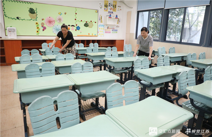 8月27日,开学在即,南京市建邺区金地名京幼儿园组织老师们对校园进行清洁,积极做好校园内外环境保洁、布置教室、消毒物资储备等工作,保障学生在新学期有个安全、干净、卫生的校园环境。方东旭 摄 视觉江苏网供图