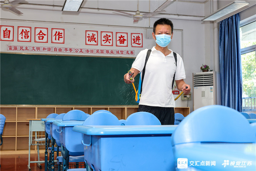 8月22日,无锡市湖滨中学的职工对校园、教室等场所进行消杀迎接新学期的到来。朱吉鹏 摄 视觉江苏网供图