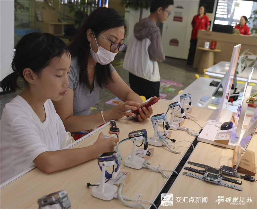 8月27日,泗洪县新华书店内学习用品区,家长带着孩子前来选购新书包,为即将到来的新学期做好准备。李佳 摄 视觉江苏网供图